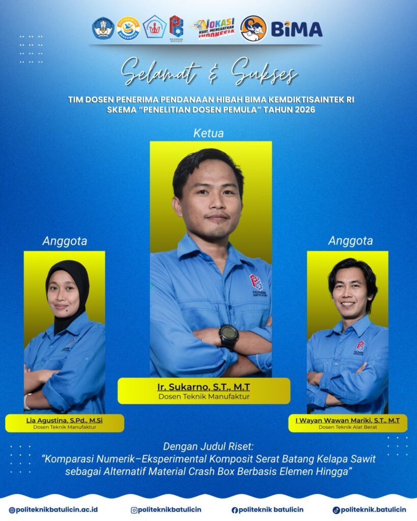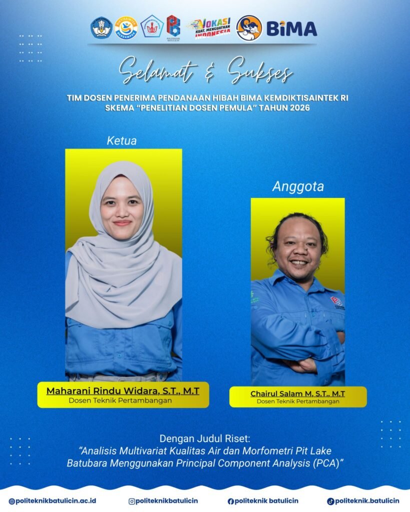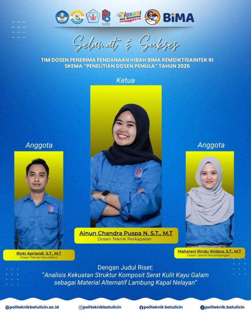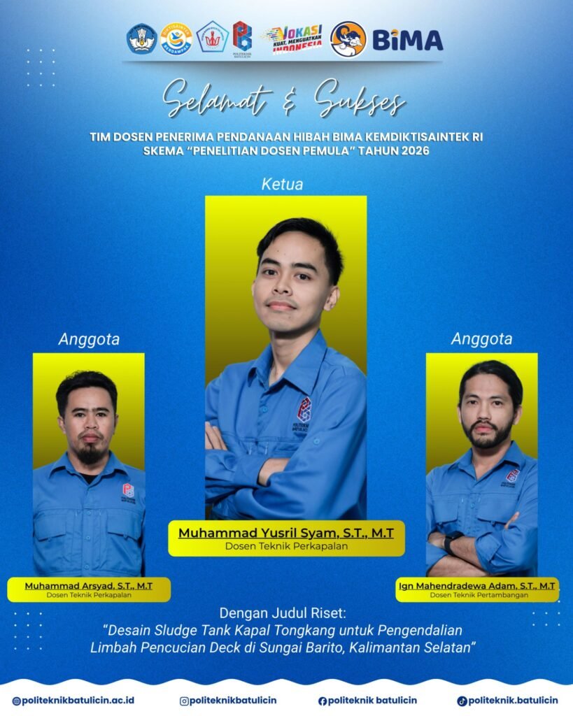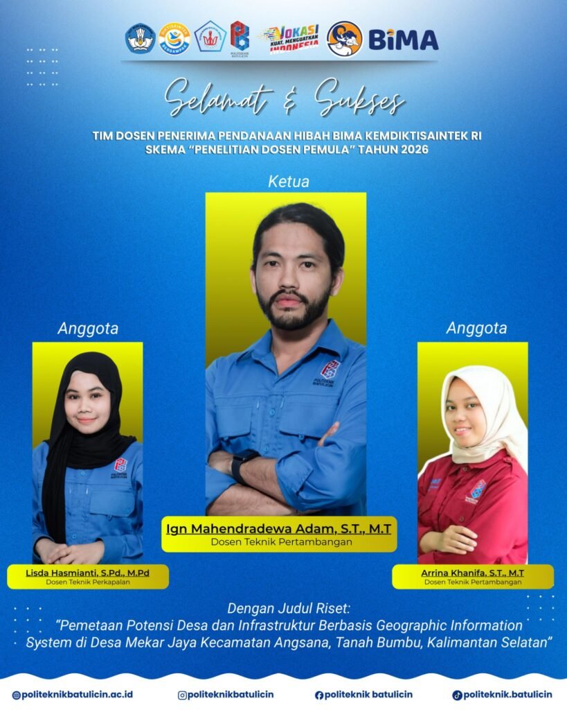 Berikut adalah daftar tim peneliti Politeknik Batulicin yang berhasil meraih pendanaan hibah BIMA tahun 2026 beserta judul penelitiannya:
