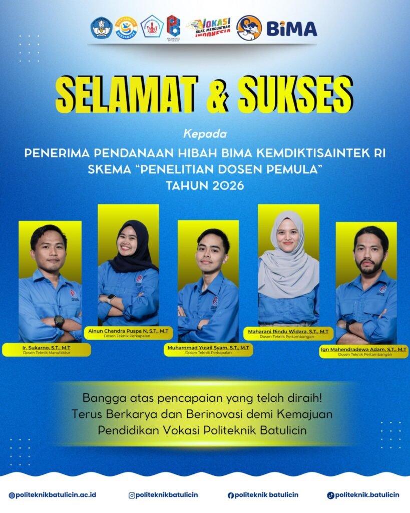 Kabar gembira dan prestasi membanggakan kembali mewarnai perjalanan akademik civitas akademika Politeknik Batulicin di tahun 2026 ini. Segenap pimpinan dan keluarga besar Politeknik Batulicin mengucapkan Selamat dan Sukses kepada lima tim peneliti yang telah berhasil meraih pendanaan Program Hibah BIMA (Basis Informasi Penelitian dan Pengabdian kepada Masyarakat) dari Kementerian Pendidikan, Kebudayaan, Riset, dan Teknologi (Kemdiktisaintek) Republik Indonesia.